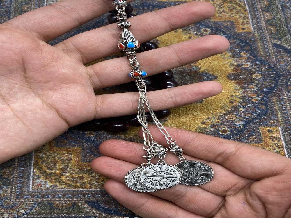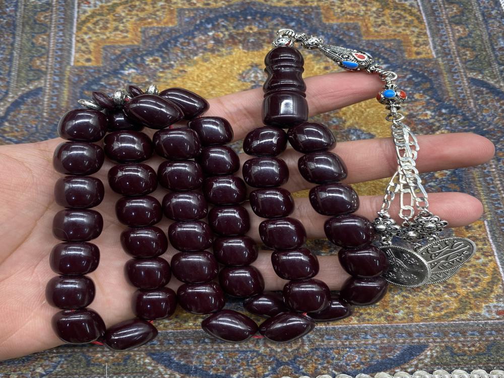 فاتوران (مسبحة) ذات لون كرزي غامق مصنوعة من حجر المأنتك، تحتوي على 45 حبة بحجم 12 ملم لكل خرزة.